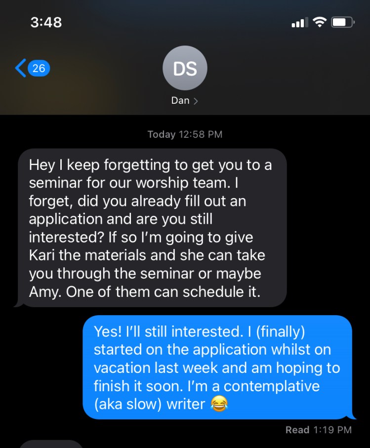 Little did I know there was an application. An application that just gave me more reason to procrastinate and ignore the Lord again. But as I said, He’s persistent. I finally received the application in June and let it “marinade” in my inbox. It sat in my email inbox for three months before a friend took up the cause and urged me to complete the process. I got halfway through the process the first time I sat down to work on it but then got a good case of writer’s block. Yay! Another excuse to procrastinate. That was a few days ago. Then today, just as I am debating whether I should finish the process or use my Sunday afternoon following other pursuits my phone dinged with a text from the worship team leader…asking about my application. My game was up, and the Lord’s persistent paid off. I finished the application.